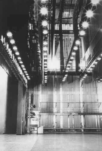 This is a photo from the Berkeley Community Theatre archives. The back wall of the stage house is to the right. About half way up the picture you can see a horizontal black line. That is the balcony on which the 32' Diaphones are mounted. It is approximately 32' off the stage floor. For those with dance experience, the stage is a "sprung" stage.